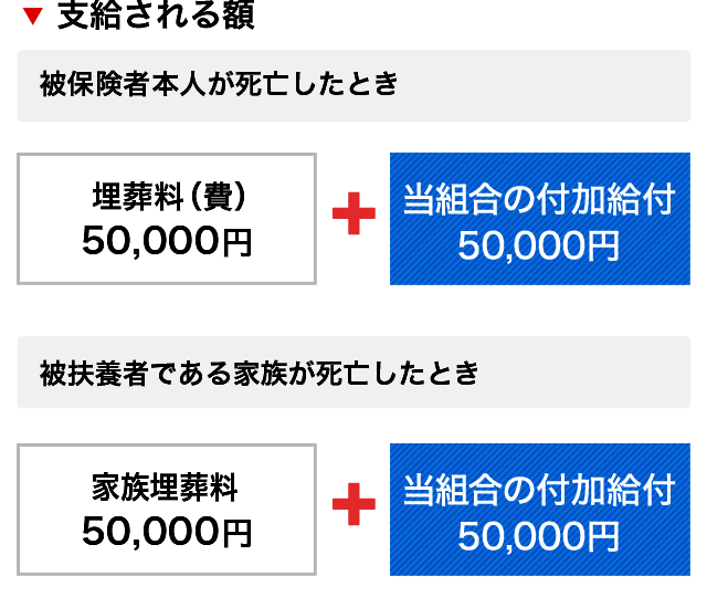 | 付加給付 | 一律50,000円(資格喪失後の死亡の場合は対象外) | ||