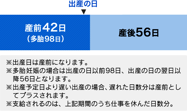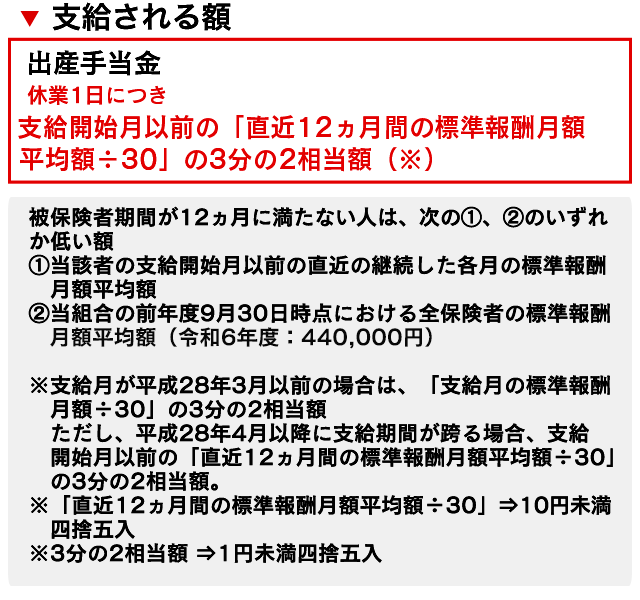 | 給付内容 | 法定給付 | 休業1日につき支給開始月以前の「直近12ヵ月間の標準報酬月額平均額÷30」の3分の2相当額(※)を出産の日以前42日(多胎98日。出産予定日が遅れた期間も支給)、出産の日後56日間 |