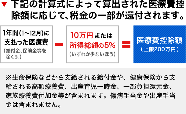 医療費控除とは、みなさんのご家族の分も含めて、1年間に支払った医療費が基準額を超えるとき務署に確定申告することにより、その超過支払い分の医療費が課税対象の所得から控除され、税金の一部が還付される制度です。