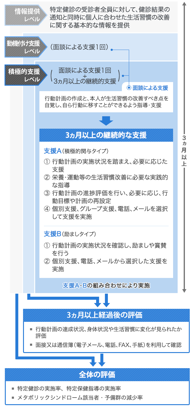 (注)2年連続して積極的支援に該当した場合、1年目の積極的支援を終了していて、かつ1年目に比べて2年目の状態が改善※していれば、2年目の特定保健指導は動機付け支援相当の支援でも可となります。