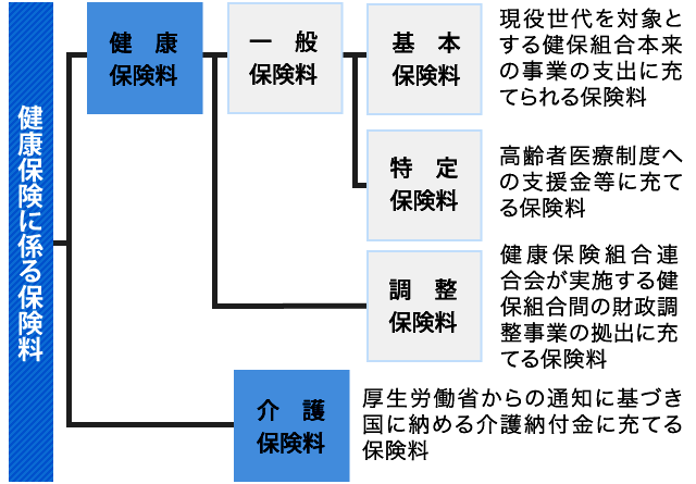 健康保険料は、主に健康保険の給付を行う財源となる保険料ですが、高齢者の医療を支援する費用をまかなうための財源にもなっています。高齢者に対してどの程度支援を行っているかをわかりやすくするために、健康保険料は、基本保険料と特定保険料に区分されています。 また健康保険料には、 基本調整保険料率1000分の1.3に、その組合の財政に応じた若干の増減率(修正率)を乗じて決められる調整保険料も含まれています。