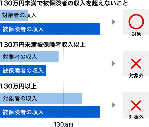 - 対象者の年収が130万円(被扶養配偶者を除く19歳以上23歳未満の者の年間収入は150万円未満。 60歳以上または障害年金の受給要件に該当する程度の障がい者は180万円)未満で、被保険者の収入を超えない方。