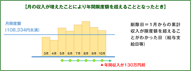 1月からの累計収入が130万円以上(被扶養配偶者を除く19歳以上23歳未満の者の年間収入は150万円以上。60歳以上または概ね障害年金受給要件に該当する程度の障がい者は180万円以上)を超えることがわかった日(給与支給日等)で削除。