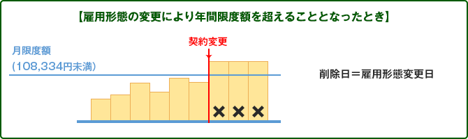 | パートの雇用形態変更 | 雇用形態変更により、年間収入推計額が130万円以上(被扶養配偶者を除く19歳以上23歳未満の者の年間収入は150万円以上。60歳以上または概ね障害年金受給要件に該当する程度の障がい者は180万円以上)となった場合は、雇用形態変更日で削除 |