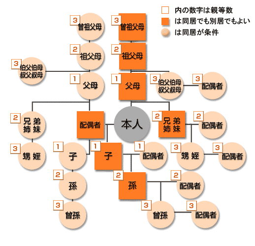 被扶養者となれる家族の範囲は、三親等内の親族と決められています。さらに、同居・別居により、条件が異なります。